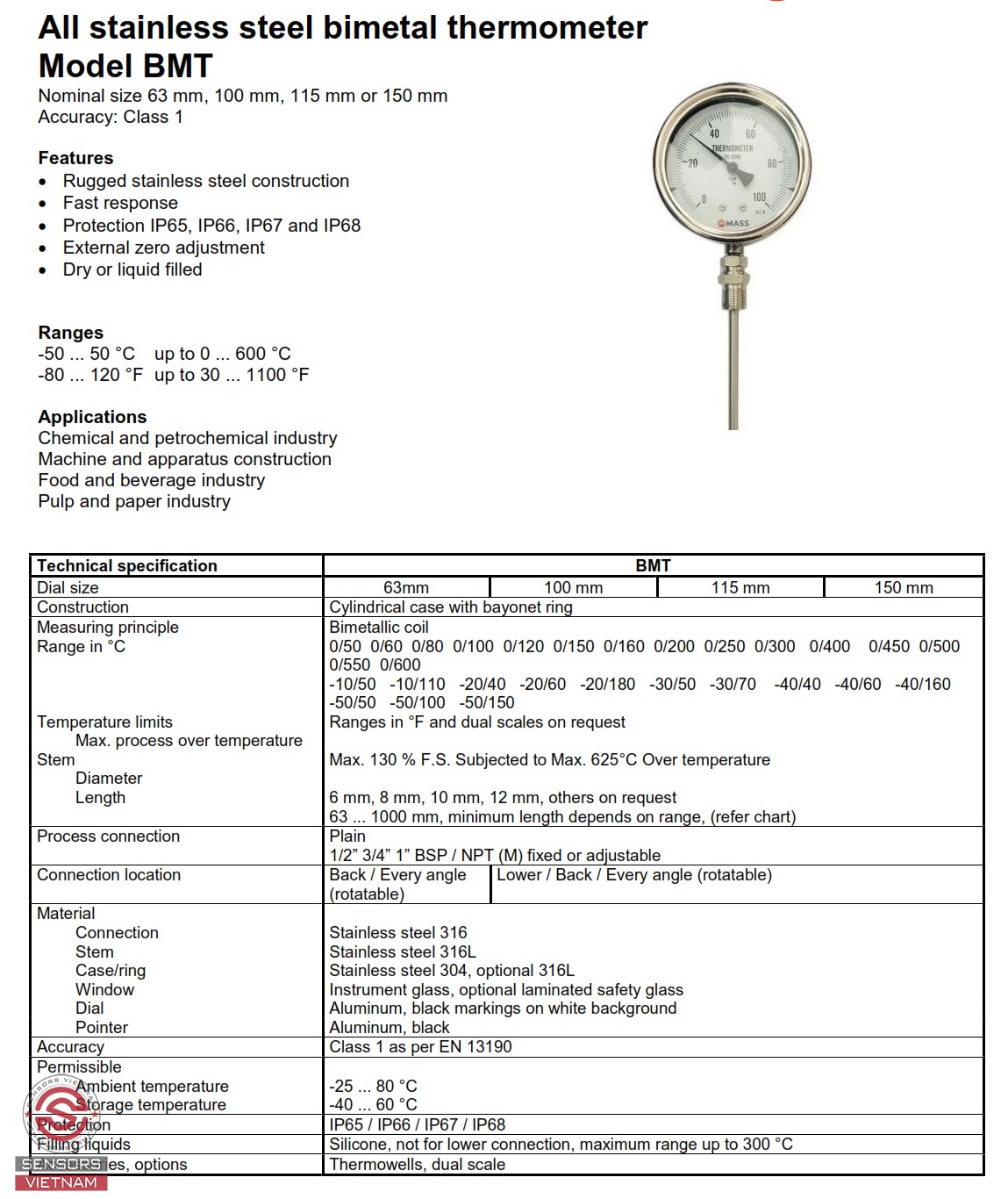 Đồng hồ đo nhiệt độ MASS được nhập khẩu chính hãng đầy đủ các thang đo, dải đo nhiệt độ từ -50 đến 600 độ C, chiều dài đầu dò và mặt đồng hồ khác nhau như 63mm, 100 mm, 150 mm, 250 mm sử dụng hầu hết cho các hệ thống đo nhiệt độ khác nhau trong nhà máy, khu công nghiệp, dầu khí, hàng hải.