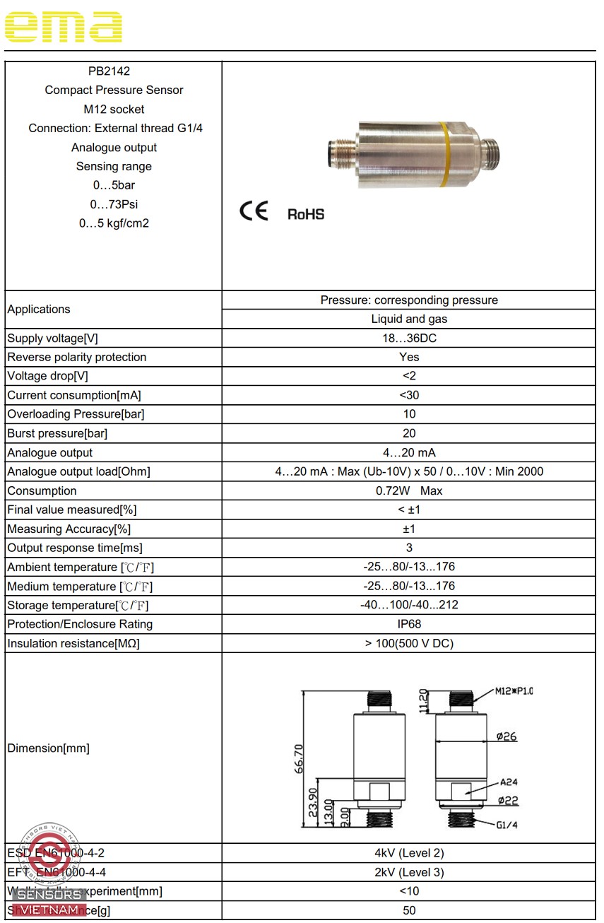 Cảm biến áp suất 5 bar PB2142 có dải đo 0 đến 5 bar, ngõ ra 4-20mA, rent G1/4" là dòng cảm biến chất lượng và giá tốt của EMA. Quý khách hoàn toàn yên tâm về chất lượng cảm biến với chế độ bảo hành 12 tháng 1 đổi 1, chứng chỉ CO/CQ đầy đủ.