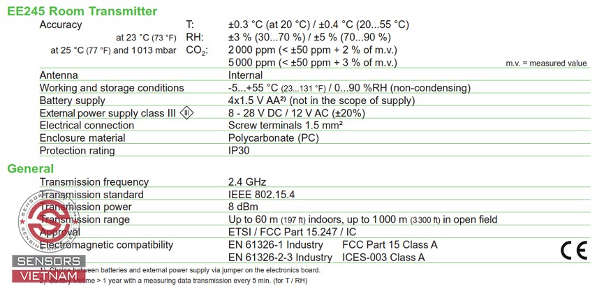 Cảm biến không dây mô-đun EE245 dựa trên giao thức IEEE 802.15.4 với tần số truyền 2,4 GHz và đo tới ba đại lượng vật lý: độ ẩm tương đối, nhiệt độ và CO2.