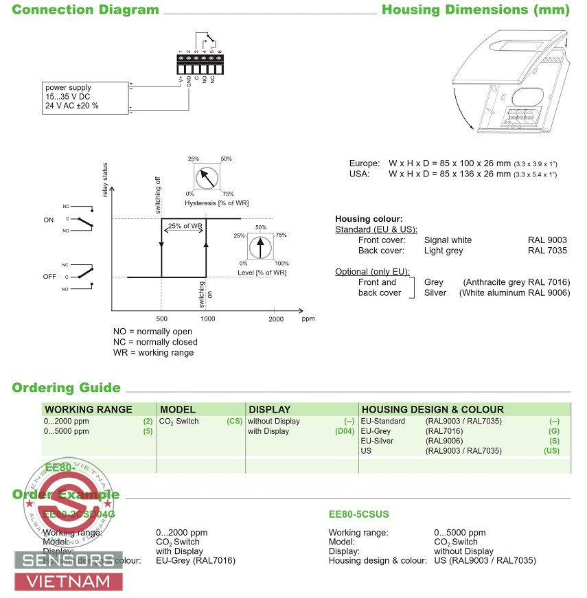 Công tắc khí CO2 EE80-2CS: Dải đo 0-2000ppm, tùy chọn cài đặt ngõ ra relay báo động nồng độ CO2 vượt ngưỡng.