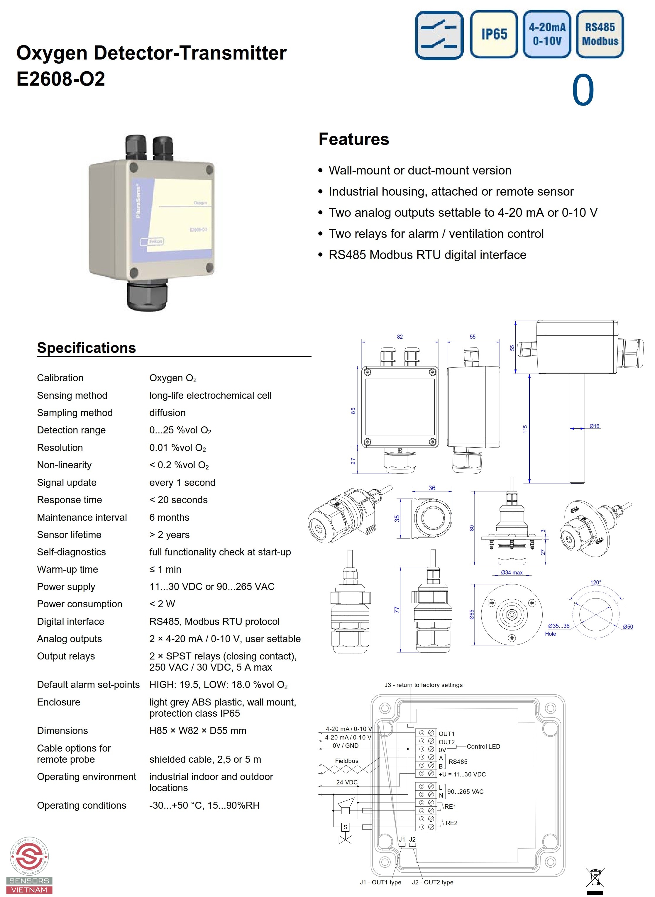 Mô tả: Sensors Việt Nam đại lý phân phối chính thức cảm biến O2 Evikon (EU/G7) tại Việt Nam, đại lý phân phối chính thức cảm biến O2 Evikon E2608-O2, chuyên phân phối Cảm biến O2, đại lý Cảm biến O2 với tín hiệu output Analog hoặc relay các các chuẩn truyền thông khác. Cảm biến O2 là một cảm biến khí được dùng trong các thiết bị kiểm tra chất lượng không khí phát hiện khí với những tính năng như khoảng đo rộng, phát hiện nhanh độ nhạy cao nên được ứng dụng rộng rãi trong công nghiệp và dân dụng.