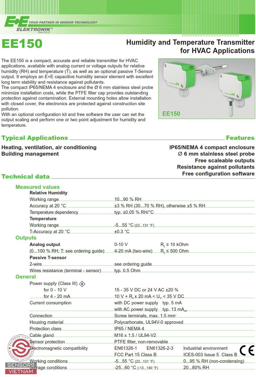 Cảm biến nhiệt độ và độ ẩm EE150 của hãng sản xuất E+E Elektronik/Áo được thiết kế đặc biệt cho hệ thống HVAC và tự động hoá toà nhà. Dòng cảm biến nhiệt độ và độ ẩm EE150 mang lại hiệu quả về chi phí, có độ chính xác cao cho độ ẩm và nhiệt độ tương đối.