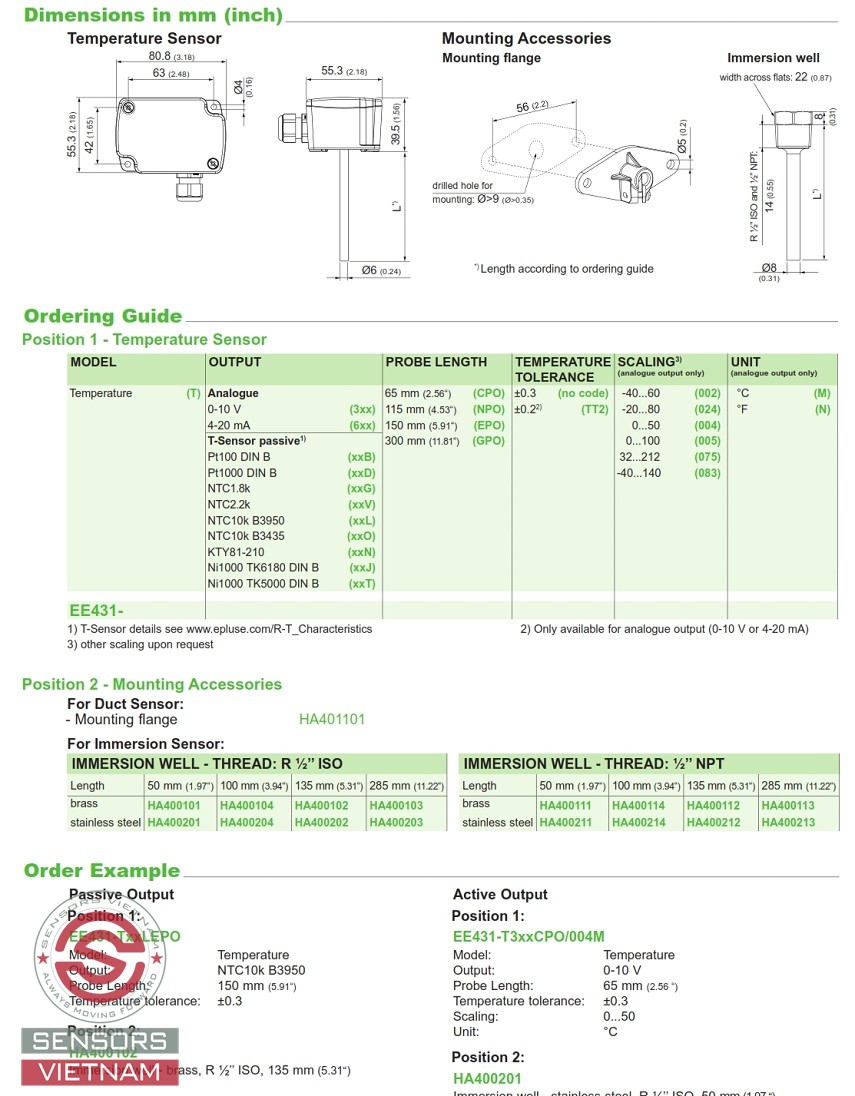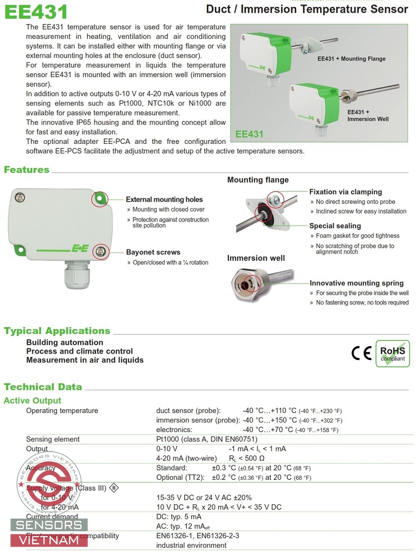 Sensors Việt Nam chuyên phân phối cảm biến nhiệt độ ống gió EE431, cảm biến nhiệt độ ống gió dùng cho tòa nhà, cảm biến nhiệt độ ống gió EE431 sử dụng rộng rãi trong hệ thống đo nhiệt độ ống gió với tín hiệu đầu ra 4-20 mA. Cảm biến nhiệt độ EE431, Cảm biến nhiệt độ chất khí EE431 cho độ chính xác cao và phù hợp đo nhiệt độ trong tòa nhà, chung cư. Hotline 0911 660 660.