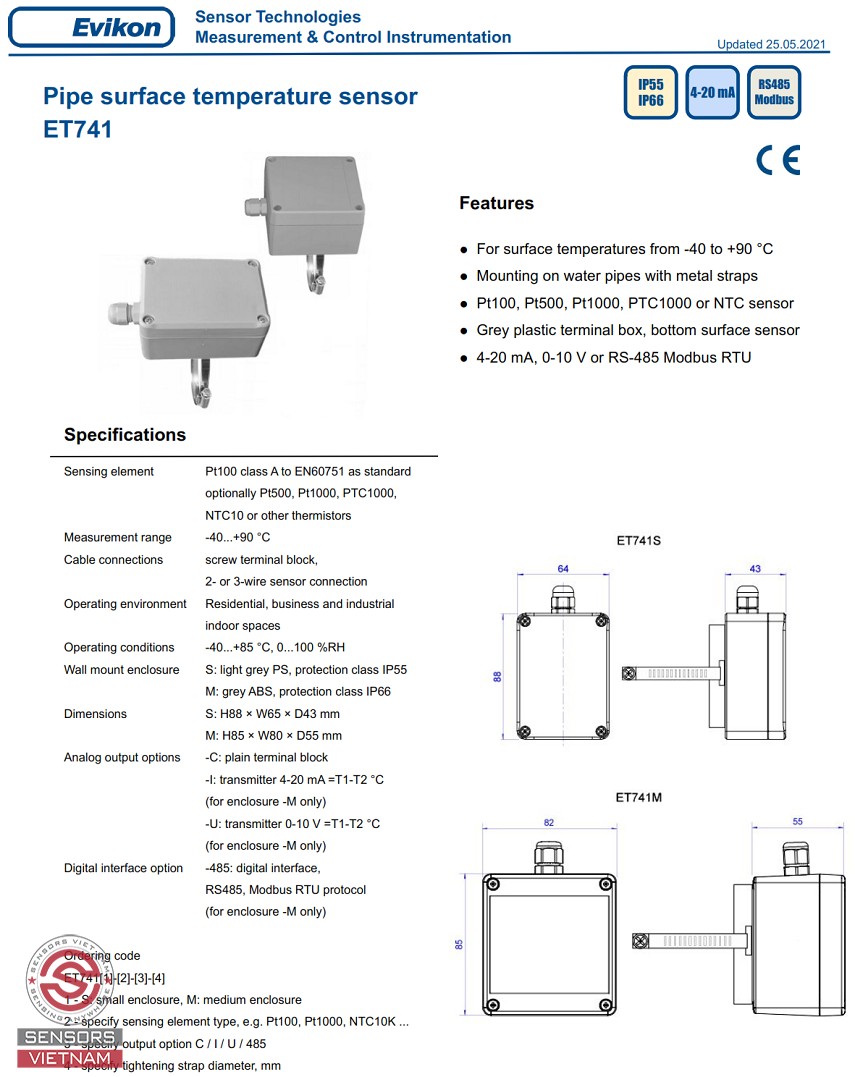 Cảm biến nhiệt độ nước ET741-M-PT100-C có dải đo -40 đến 90 độ, IP66, hàng chất lượng cao, bảo hành 12 tháng 1 đổi 1. Chứng chỉ CO/CQ đầy đủ.