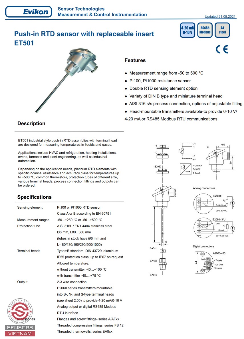 Cảm biến nhiệt độ PT1000 ET501 loại đầu củ hành có dải đo nhiệt độ từ -50 đến 500 độ C, ngõ ra 4-20mA/0-10V/RS485, đầu dò PT1000, kích thước đầu dò 6mm, chiều dài tuỳ chọn tới 1000mm. Cảm biến nhiệt độ PT1000 ET501 có xuất xứ EVIKON/G7,EU. Bảo hành 12 tháng 1 đổi 1, chứng chỉ CO/CQ đầy đủ.