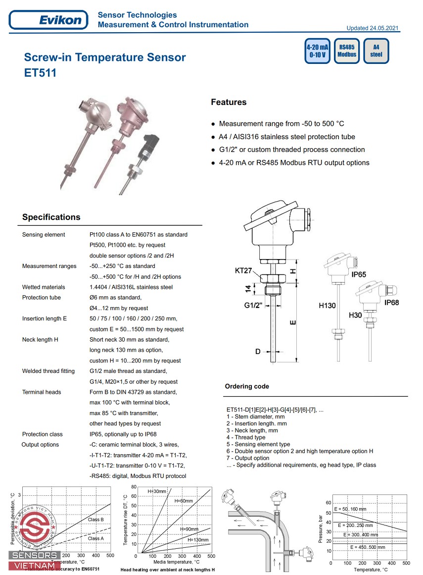 Cảm biến nhiệt độ PT1000 ET511 loại đầu củ hành có dải đo nhiệt độ từ -50 đến 500 độ C, ngõ ra 4-20mA/0-10V/RS485, đầu dò PT1000, kích thước đầu dò 6mm, chiều dài tuỳ chọn tới 1500mm. Cảm biến nhiệt độ PT1000 ET511 có xuất xứ EVIKON/G7,EU. Bảo hành 12 tháng 1 đổi 1, chứng chỉ CO/CQ đầy đủ.