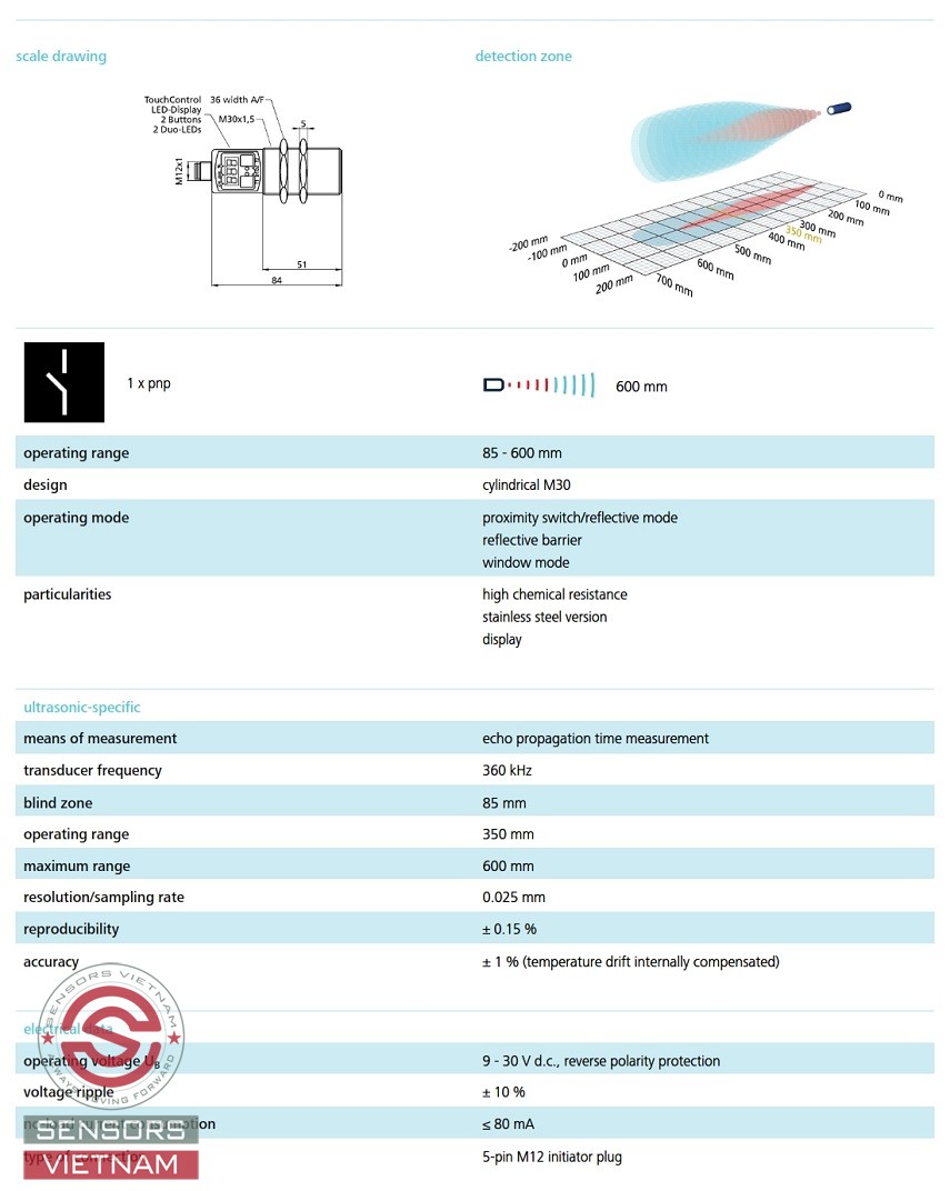 Mô tả: Cảm biến là gì? Cảm biến là một trong ba thành phần cơ bản của hệ thống điều khiển. Cảm biến là thiết bị điện tử cảm nhận những trạng thái hay quá trình vật lý hay hóa sang tín hiệu điện có thể đo lường được. Sensors Việt Nam chuyên phân phối cảm biến Siêu âm Microsonic (Germany) tại Việt Nam, Đại lý cảm biến siêu âm Microsonic, phân phối cảm biến Microsonic, Cảm biến Siêu âm CRM+35 với dải đo trong khoảng 85-600mm.