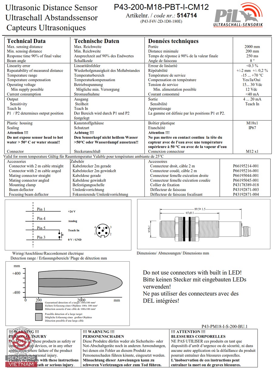 CẢM BIẾN SIÊU ÂM ĐO MỨC NƯỚC PIL P43-200-M18-PBT-I-CM12, CẢM BIẾN SIÊU ÂM ĐO MỨC CHẤT LỎNG, CẢM BIẾN SIÊU ÂM ĐO KHOẢNG CÁCH, CẢM BIẾN SIÊU ÂM PIL P43, CẢM BIẾN ĐO MỨC DẠNG SIÊU ÂM, CẢM BIẾN SIÊU ÂM 2000 MM, CẢM BIẾN SIÊU ÂM ANALOG.