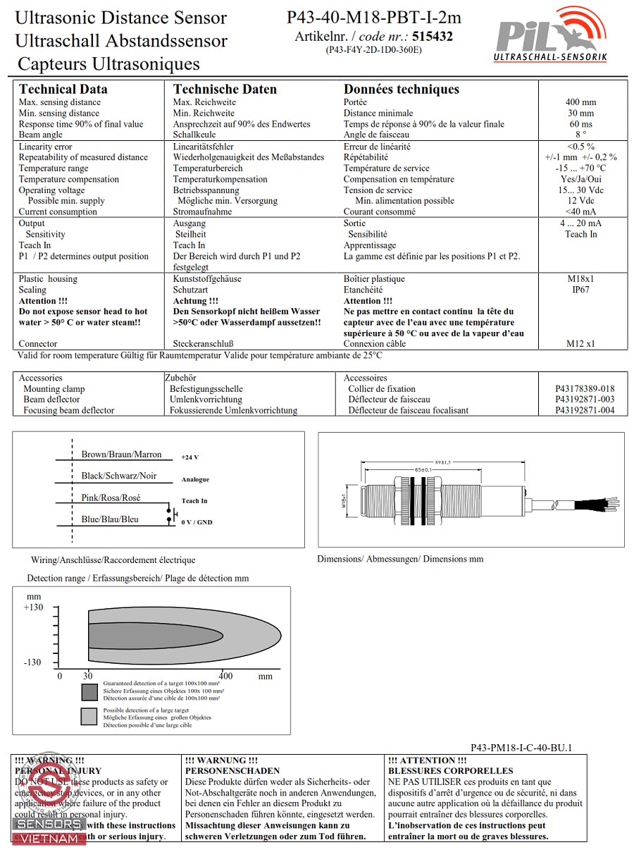 CẢM BIẾN SIÊU ÂM ĐO MỨC NƯỚC PIL P43-40-M18-PBT-I-2m, CẢM BIẾN SIÊU ÂM ĐO MỨC CHẤT LỎNG, CẢM BIẾN SIÊU ÂM ĐO KHOẢNG CÁCH, CẢM BIẾN SIÊU ÂM PIL P43, CẢM BIẾN ĐO MỨC DẠNG SIÊU ÂM, CẢM BIẾN SIÊU ÂM 400 MM, CẢM BIẾN SIÊU ÂM ANALOG.