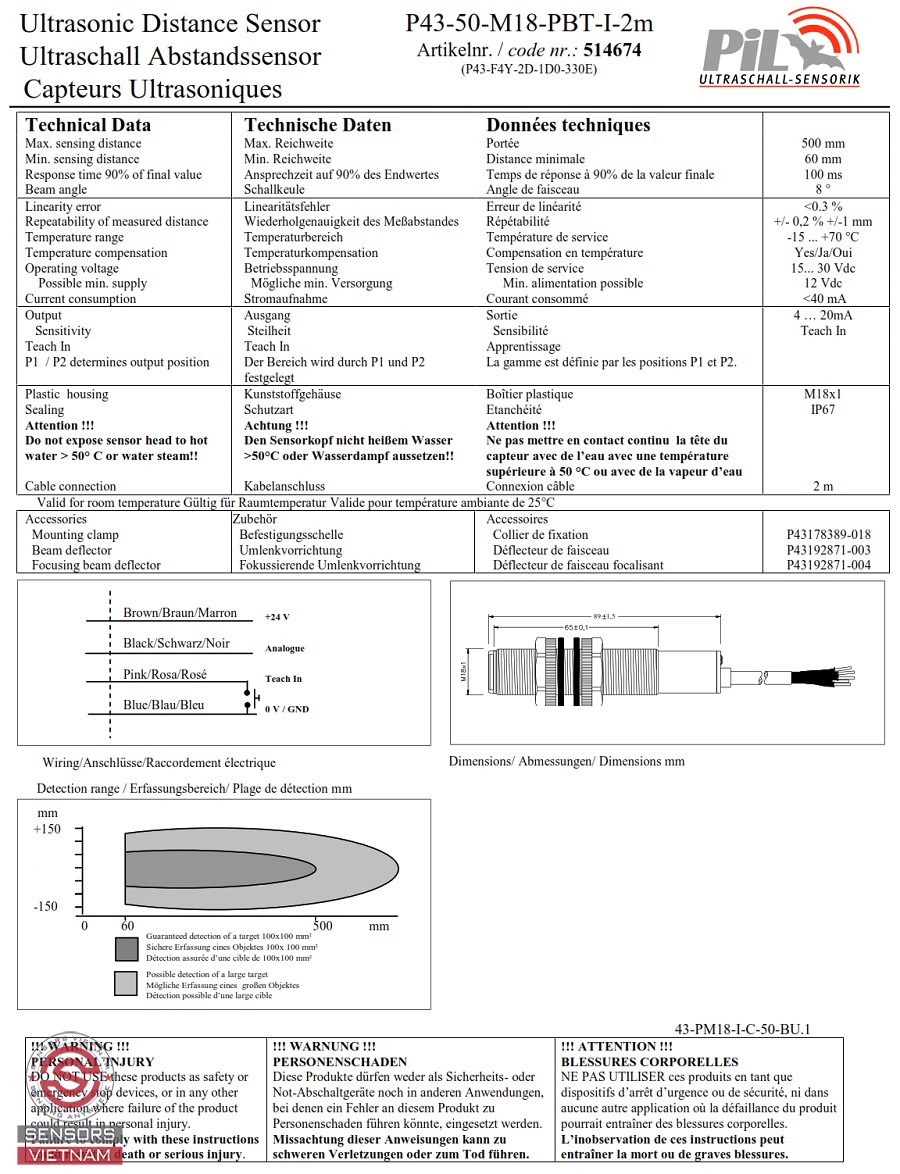Trên thị trường hiện nay có rất nhiều hãng cảm biến siêu âm trong đó PIL SENSOREN GMBH là hãng cảm biến siêu âm nổi tiếng trên toàn thế giới với lịch sử phát triển hàng trăm năm với giá cả cạnh tranh và chất lượng Đức. Cảm biến siêu âm đo mức nước PIL P43 là dòng cảm biến siêu âm nhỏ gọn, chất lượng cao của PIL - Germany.