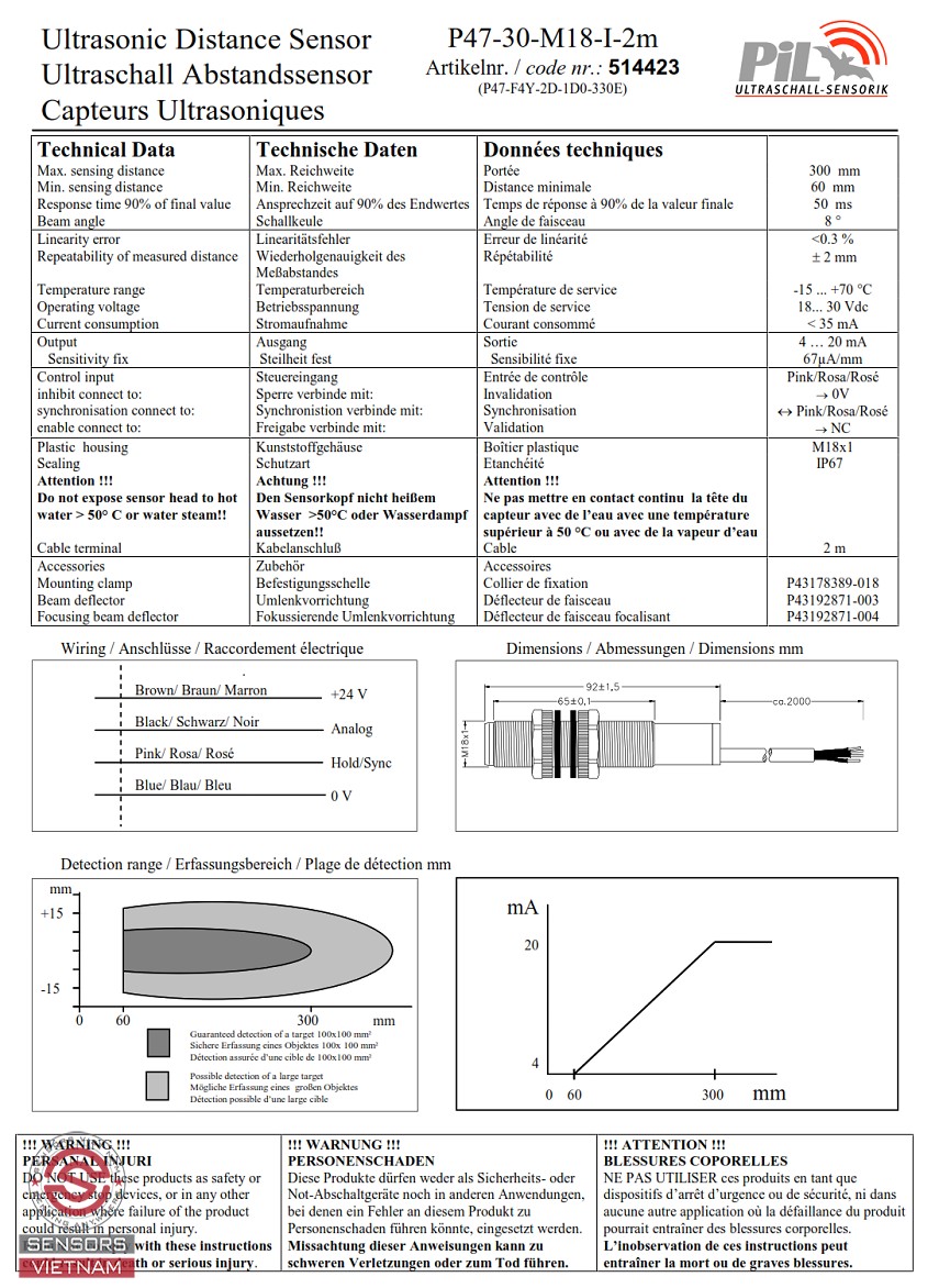 CẢM BIẾN SIÊU ÂM ĐO MỨC NƯỚC PIL P47-30-M18-I-2m, CẢM BIẾN SIÊU ÂM ĐO MỨC CHẤT LỎNG, CẢM BIẾN SIÊU ÂM ĐO KHOẢNG CÁCH, CẢM BIẾN SIÊU ÂM PIL P47, CẢM BIẾN ĐO MỨC DẠNG SIÊU ÂM, CẢM BIẾN SIÊU ÂM 300 MM, CẢM BIẾN SIÊU ÂM ANALOG.