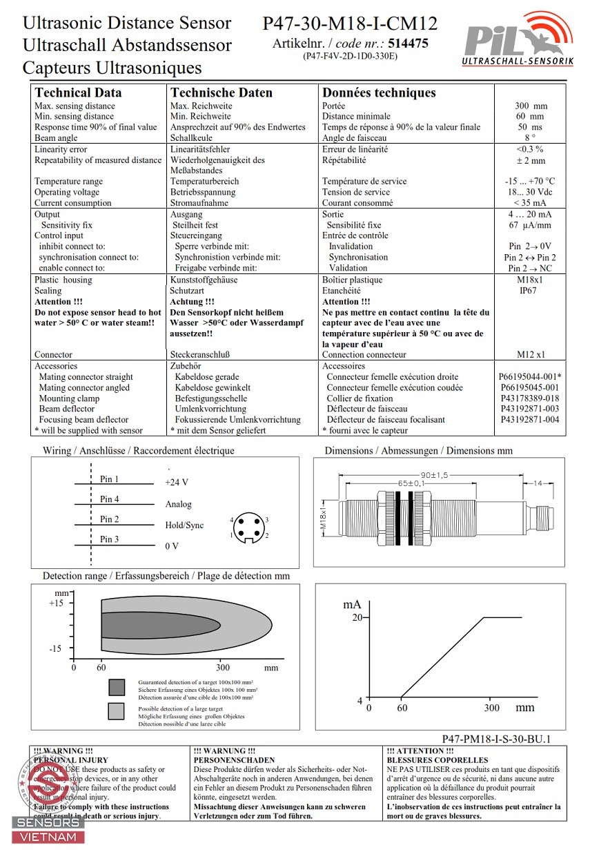 CẢM BIẾN SIÊU ÂM ĐO MỨC NƯỚC PIL P47-30-M18-I-CM12, CẢM BIẾN SIÊU ÂM ĐO MỨC CHẤT LỎNG, CẢM BIẾN SIÊU ÂM ĐO KHOẢNG CÁCH, CẢM BIẾN SIÊU ÂM PIL P47, CẢM BIẾN ĐO MỨC DẠNG SIÊU ÂM, CẢM BIẾN SIÊU ÂM 300 MM, CẢM BIẾN SIÊU ÂM ANALOG.