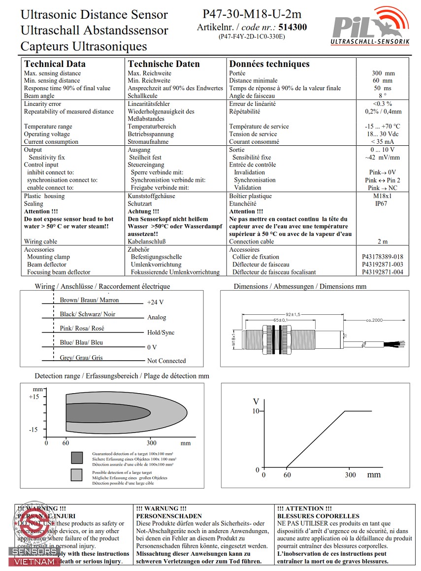 CẢM BIẾN SIÊU ÂM ĐO MỨC NƯỚC PIL P47-30-M18-U-2m, CẢM BIẾN SIÊU ÂM ĐO MỨC CHẤT LỎNG, CẢM BIẾN SIÊU ÂM ĐO KHOẢNG CÁCH, CẢM BIẾN SIÊU ÂM PIL P47, CẢM BIẾN ĐO MỨC DẠNG SIÊU ÂM, CẢM BIẾN SIÊU ÂM 300 MM, CẢM BIẾN SIÊU ÂM ANALOG.
