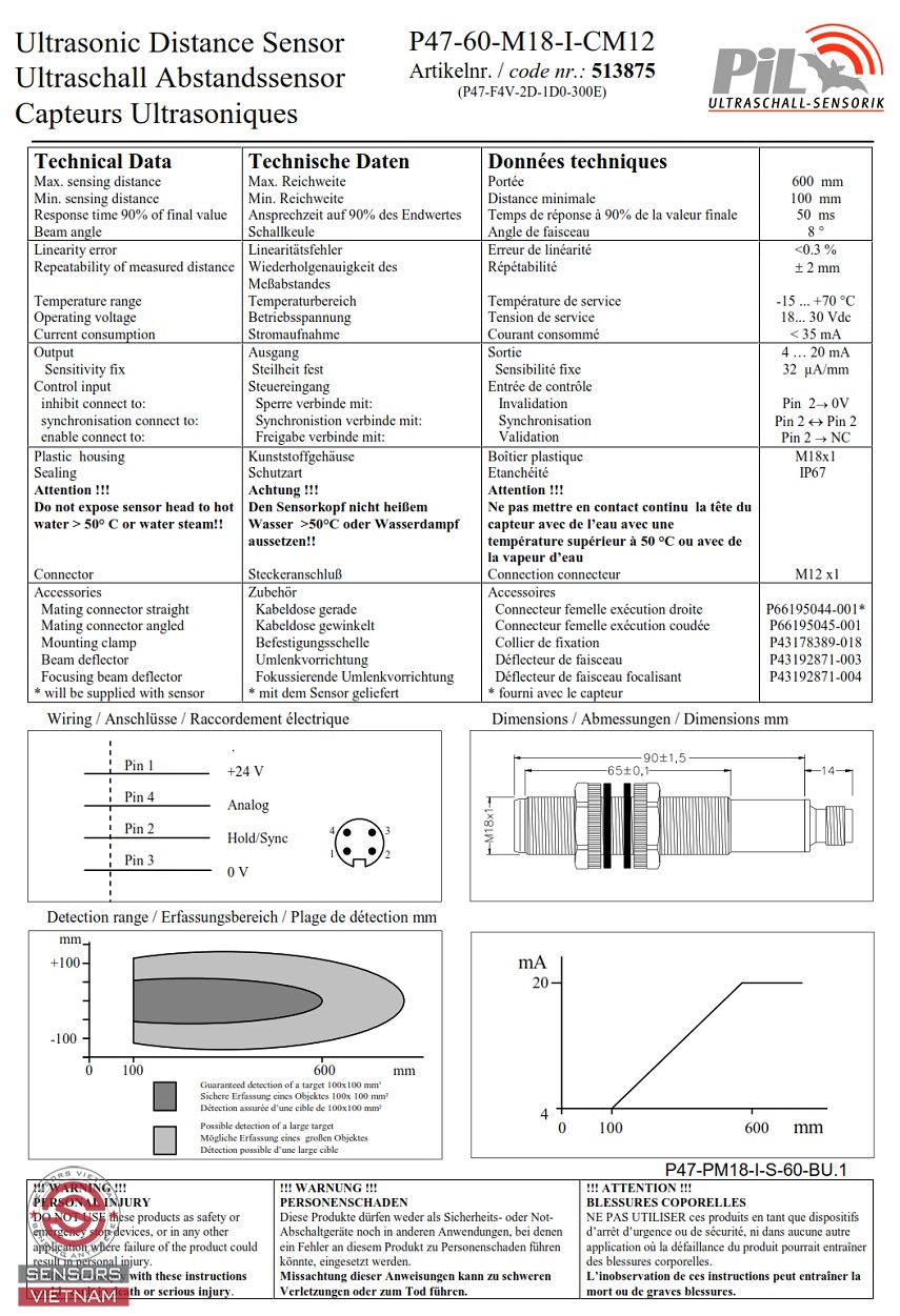CẢM BIẾN SIÊU ÂM ĐO MỨC NƯỚC PIL P47-60-M18-I-CM12, CẢM BIẾN SIÊU ÂM ĐO MỨC CHẤT LỎNG, CẢM BIẾN SIÊU ÂM ĐO KHOẢNG CÁCH, CẢM BIẾN SIÊU ÂM PIL P47, CẢM BIẾN ĐO MỨC DẠNG SIÊU ÂM, CẢM BIẾN SIÊU ÂM 600 MM, CẢM BIẾN SIÊU ÂM ANALOG.