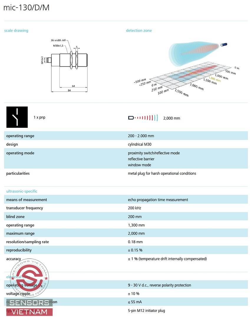 Cảm biến siêu âm mic-130/D/M dải đo 200-2000mm cho độ ổn định và độ chính xác cao được sử dụng rộng rãi trong công nghiệp.
