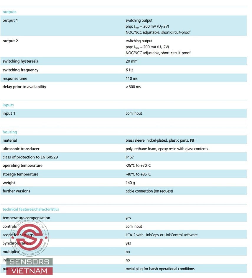 Cảm biến siêu âm dải đo 1m, Cảm biến siêu âm dải đo 2m, Cảm biến siêu âm dải đo 3m, Cảm biến siêu âm dải đo 5m, Cảm biến siêu âm dải đo 6m, Cảm biến siêu âm dải đo 8m, Cảm biến siêu âm dải đo 10m, Cảm biến siêu âm dải đo 15m, Cảm biến siêu âm dải đo 20m. Cảm biến siêu âm với tín hiệu output dạng Analog 4-20mA/0-10V, Cảm biến siêu âm với tín hiệu output dạng PNP thích hợp điều khiển và giám sát mức.