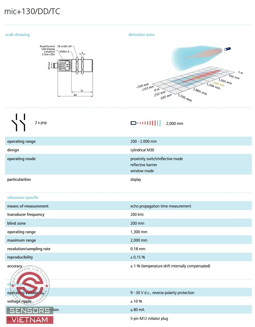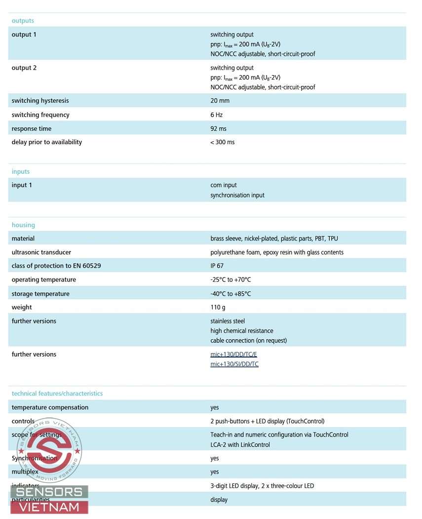 THÔNG SỐ KỸ THUẬT CỦA CẢM BIẾN SIÊU ÂM MIC+130/DD/TC MICROSONIC NHƯ SAU: