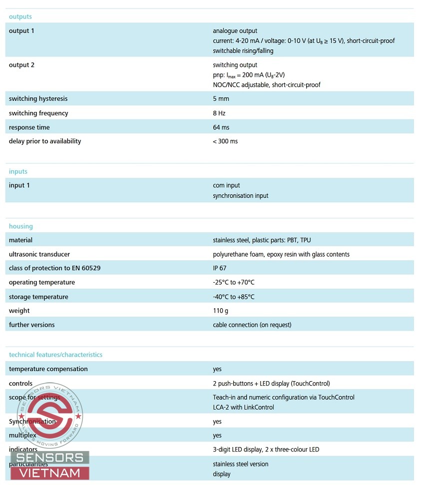 THÔNG SỐ KỸ THUẬT CỦA CẢM BIẾN SIÊU ÂM MIC+130/DIU/TC/E MICROSONIC NHƯ SAU: