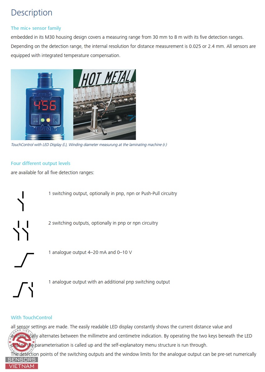 Mô tả: CẢM BIẾN SIÊU ÂM MIC+25, CẢM BIẾN SIÊU ÂM ĐO MỨC NƯỚC, CẢM BIẾN SIÊU ÂM CÔNG NGHIỆP, ĐẦU DÒ CẢM BIẾN SIÊU ÂM, CẢM BIẾN SIÊU ÂM PHÁT HIỆN VẬT CẢN, CẢM BIẾN SIÊU ÂM ĐO KHOẢNG CÁCH, CẢM BIẾN SIÊU ÂM MICROSONIC, CẢM BIẾN SÓNG SIÊU ÂM.