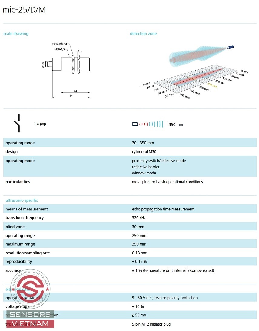 Cảm biến siêu âm mic-25/D/M dải đo 35-350mm cho độ ổn định và độ chính xác cao được sử dụng rộng rãi trong công nghiệp.