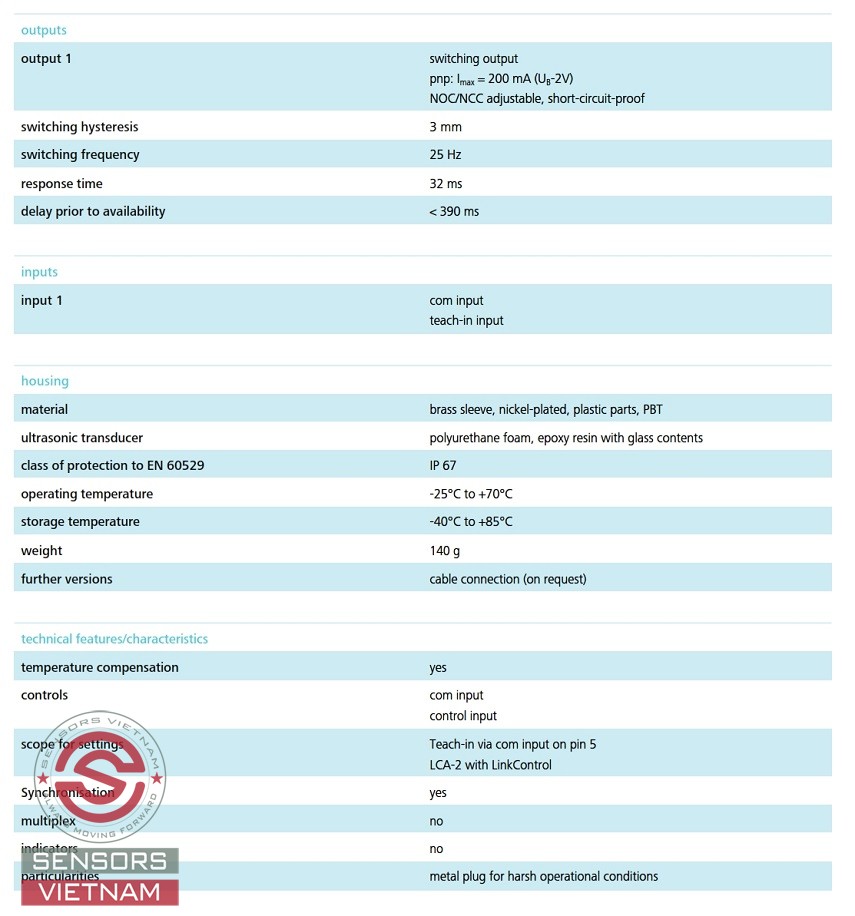 Cảm biến siêu âm dải đo 1m, Cảm biến siêu âm dải đo 2m, Cảm biến siêu âm dải đo 3m, Cảm biến siêu âm dải đo 5m, Cảm biến siêu âm dải đo 6m, Cảm biến siêu âm dải đo 8m, Cảm biến siêu âm dải đo 10m, Cảm biến siêu âm dải đo 15m, Cảm biến siêu âm dải đo 20m. Cảm biến siêu âm với tín hiệu output dạng Analog 4-20mA/0-10V, Cảm biến siêu âm với tín hiệu output dạng PNP thích hợp điều khiển và giám sát mức.