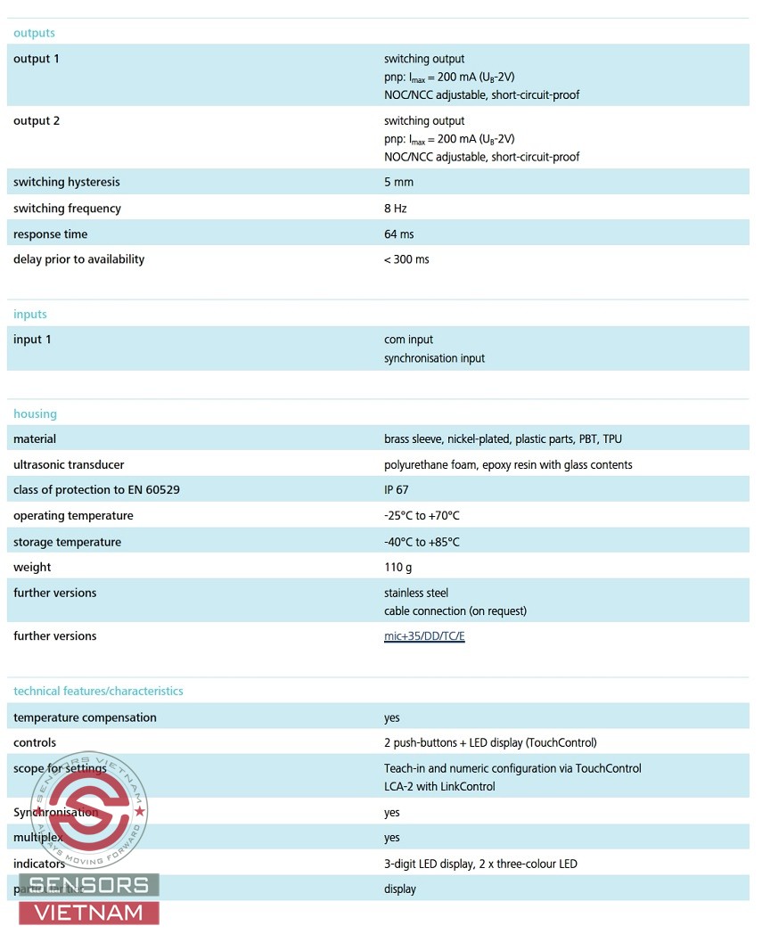 THÔNG SỐ KỸ THUẬT CỦA CẢM BIẾN SIÊU ÂM MIC+35/DD/TC MICROSONIC NHƯ SAU: