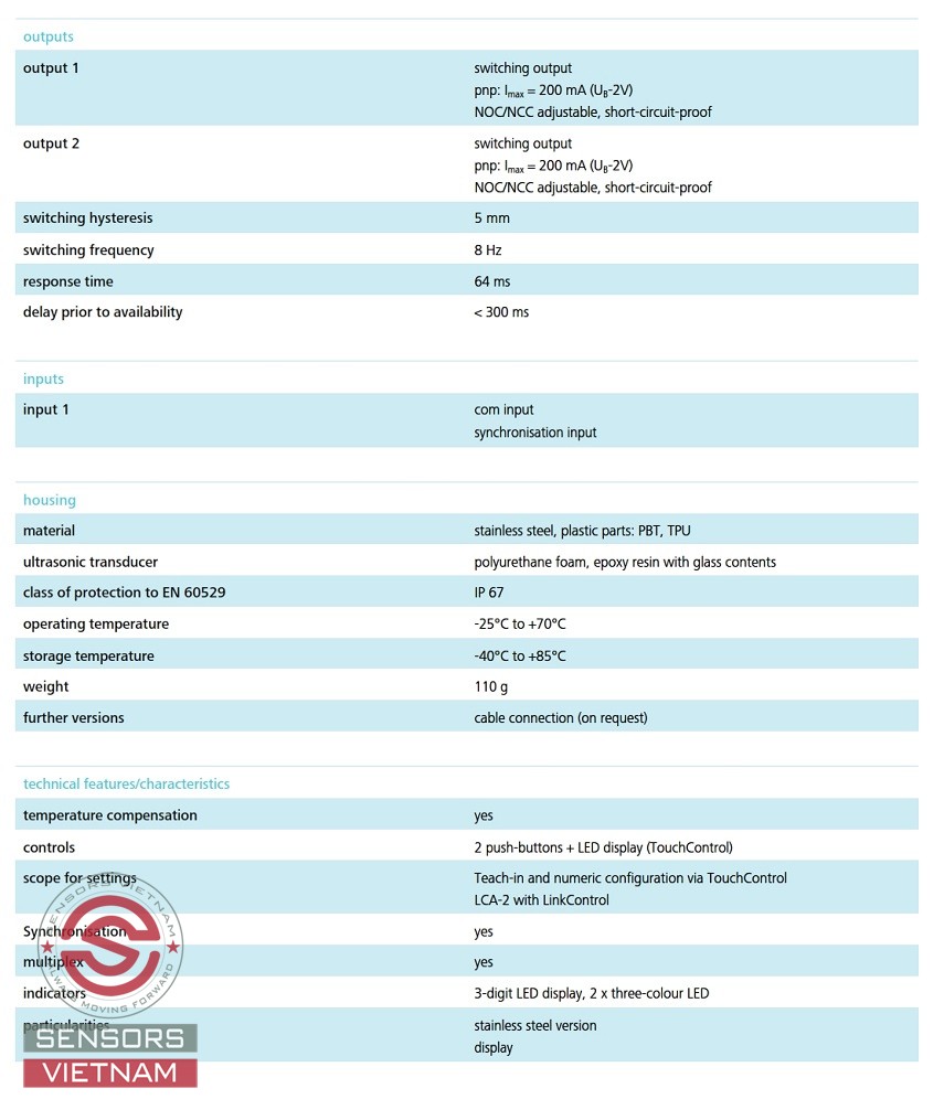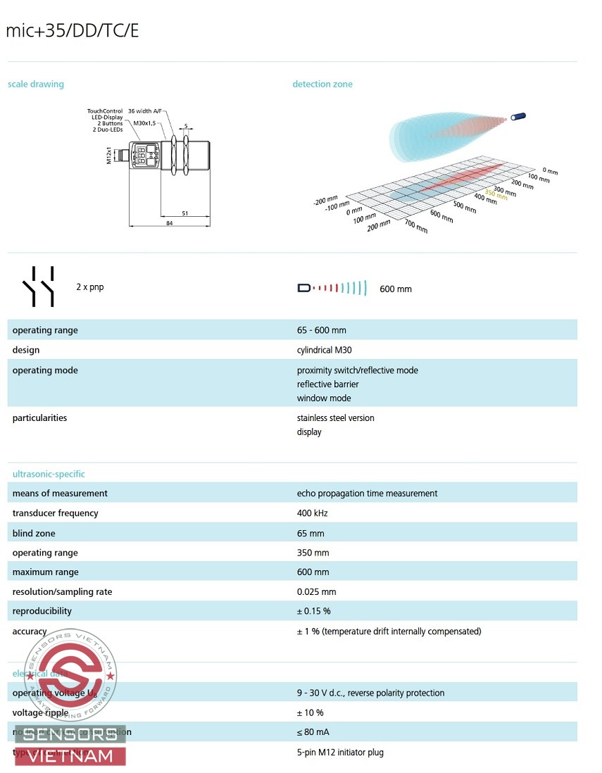 THÔNG SỐ KỸ THUẬT CỦA CẢM BIẾN SIÊU ÂM MIC+35/DD/TC/E MICROSONIC NHƯ SAU: