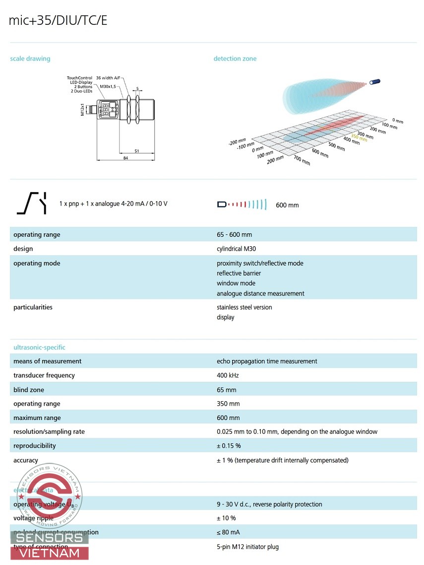 THÔNG SỐ KỸ THUẬT CỦA CẢM BIẾN SIÊU ÂM MIC+35/DIU/TC/E MICROSONIC NHƯ SAU: