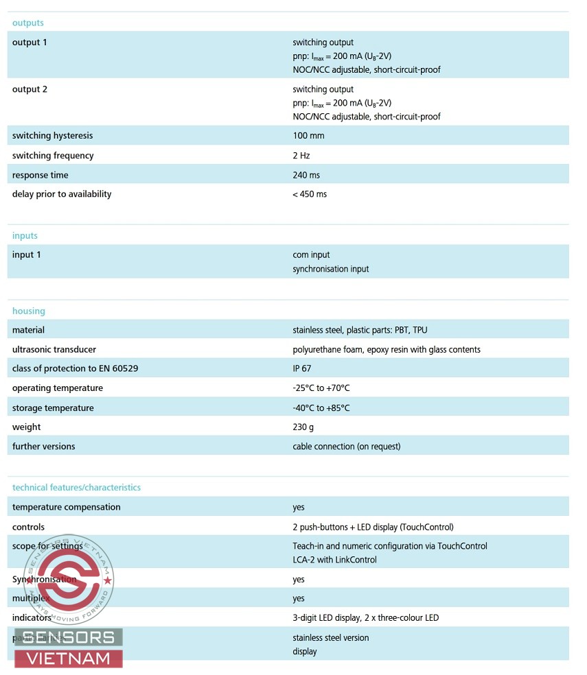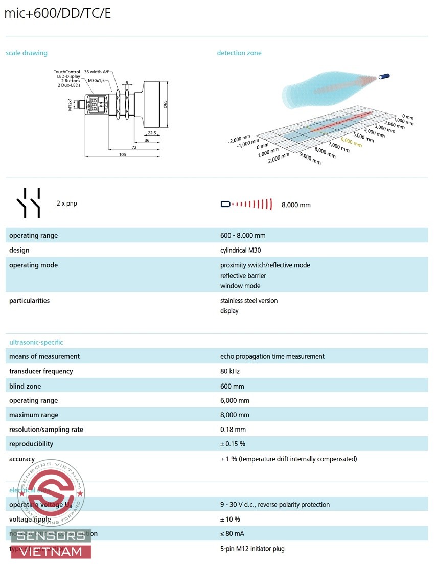 THÔNG SỐ KỸ THUẬT CỦA CẢM BIẾN SIÊU ÂM MIC+600/DD/TC/E MICROSONIC NHƯ SAU: