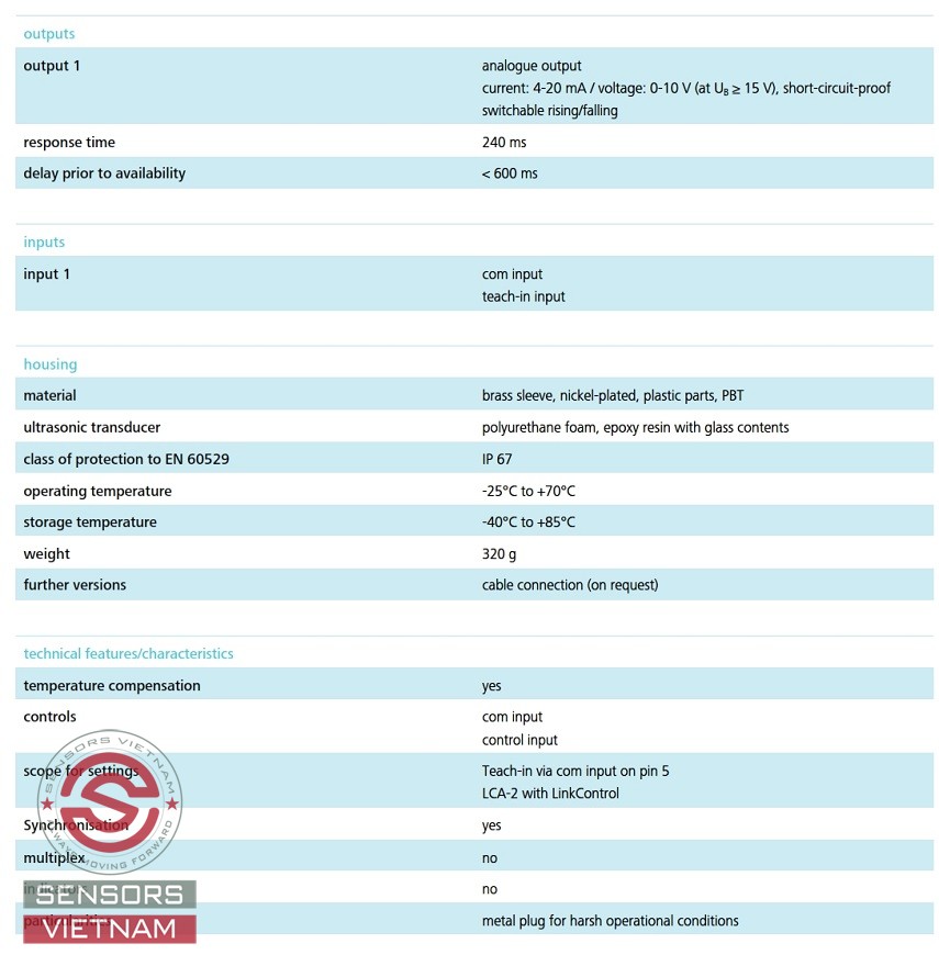 Cảm biến siêu âm dải đo 1m, Cảm biến siêu âm dải đo 2m, Cảm biến siêu âm dải đo 3m, Cảm biến siêu âm dải đo 5m, Cảm biến siêu âm dải đo 6m, Cảm biến siêu âm dải đo 8m, Cảm biến siêu âm dải đo 10m, Cảm biến siêu âm dải đo 15m, Cảm biến siêu âm dải đo 20m. Cảm biến siêu âm với tín hiệu output dạng Analog 4-20mA/0-10V, Cảm biến siêu âm với tín hiệu output dạng PNP thích hợp điều khiển và giám sát mức.
