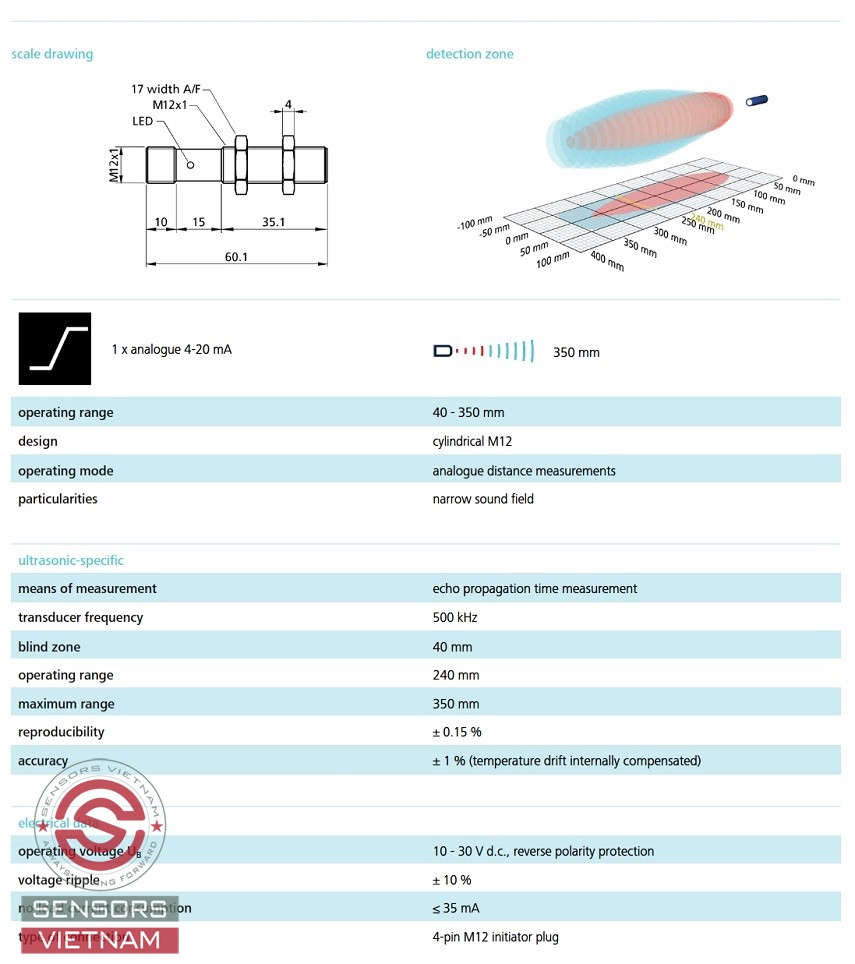 Cảm biến là gì? Cảm biến là một trong ba thành phần cơ bản của hệ thống điều khiển. Cảm biến là thiết bị điện tử cảm nhận những trạng thái hay quá trình vật lý hay hóa sang tín hiệu điện có thể đo lường được. Sensors Việt Nam chuyên phân phối cảm biến Siêu âm Microsonic (Germany) tại Việt Nam, Đại lý cảm biến siêu âm Microsonic, phân phối cảm biến Microsonic, Cảm biến Siêu âm Nano-24 với dải đo trong khoảng 40-350mm.