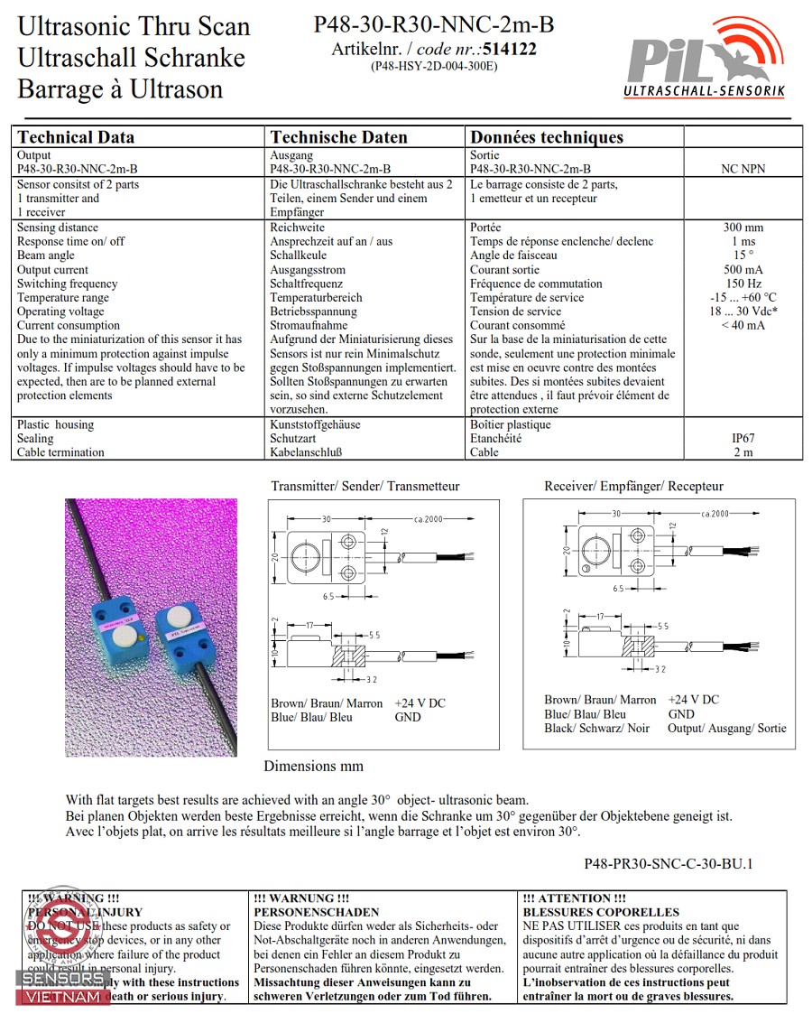 CẢM BIẾN SIÊU ÂM PHÁT HIỆN VẬT CẢN PIL P48-30-R30-NNC-2m-B, CẢM BIẾN SIÊU ÂM BÁO VẬT CẢN, CẢM BIẾN SIÊU ÂM BARRIER, CẢM BIẾN SIÊU ÂM PHÁT HIỆN SẢN PHẨM, CẢM BIẾN SIÊU ÂM BÁO SẢN PHẨM, CẢM BIẾN SIÊU ÂM NPN, RÀO CẢN SIÊU ÂM P48.