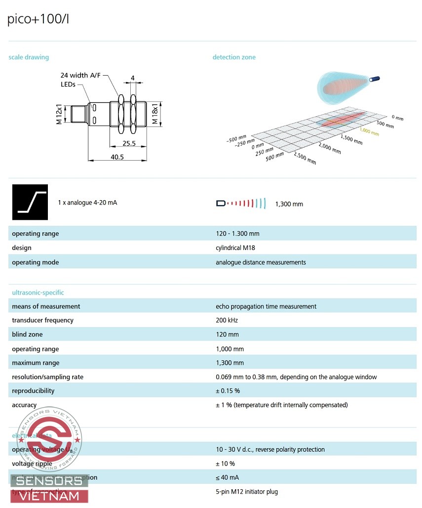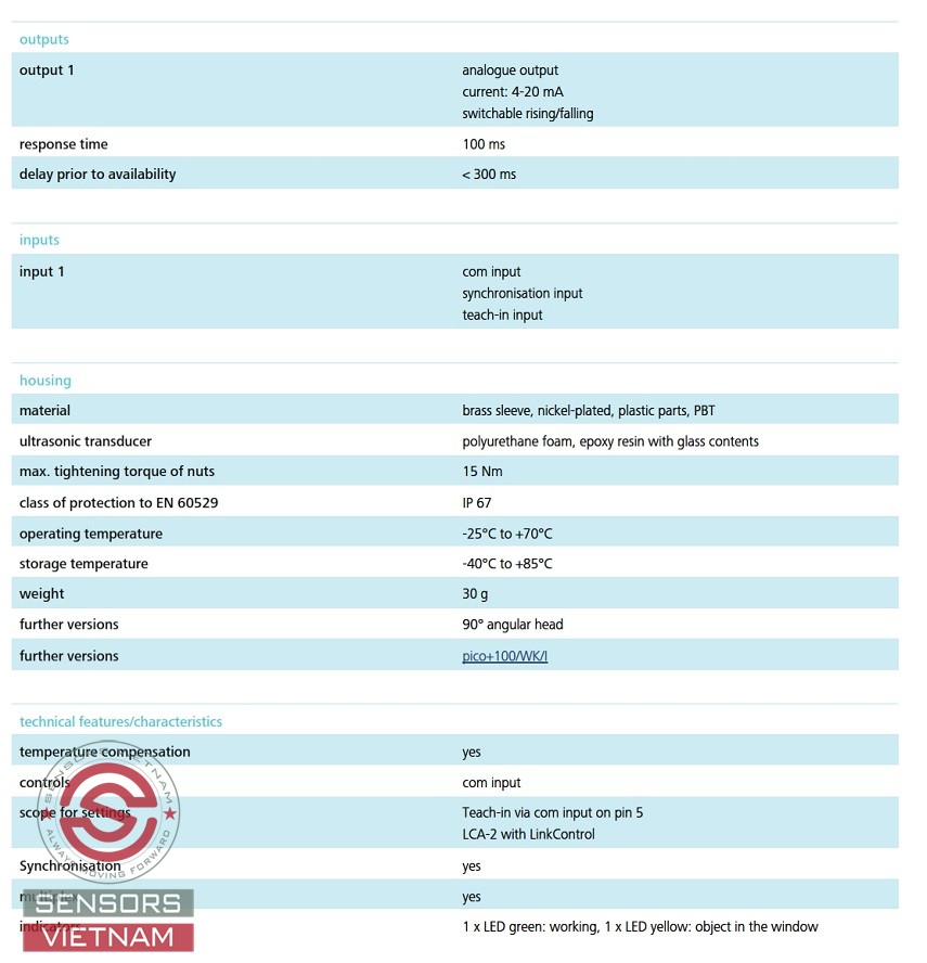 THÔNG SỐ KỸ THUẬT CỦA CẢM BIẾN SIÊU ÂM PICO+100/I MICROSONIC NHƯ SAU: