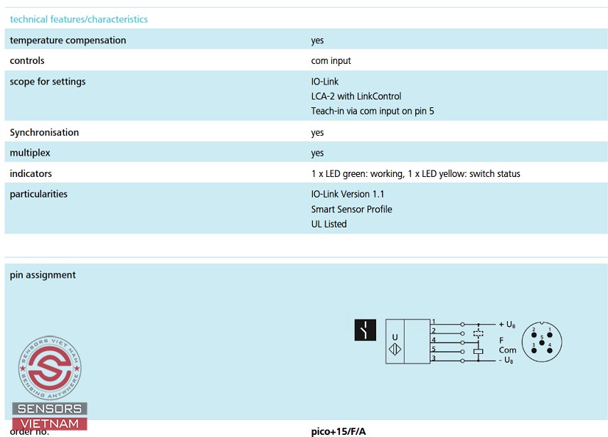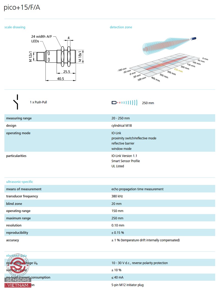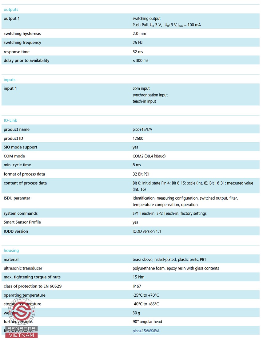 THÔNG SỐ KỸ THUẬT CỦA CẢM BIẾN SIÊU ÂM PICO+15/F/A MICROSONIC NHƯ SAU: