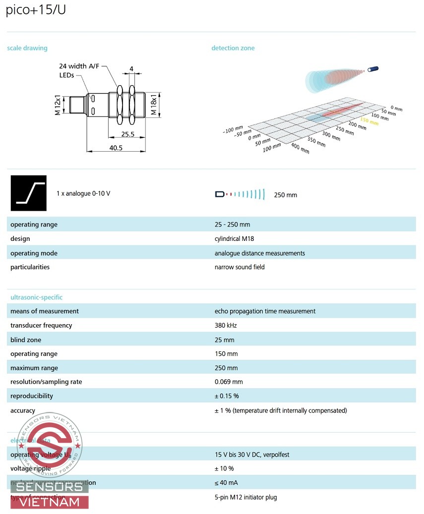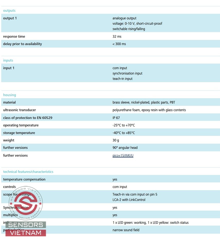 THÔNG SỐ KỸ THUẬT CỦA CẢM BIẾN SIÊU ÂM PICO+15/U MICROSONIC NHƯ SAU: