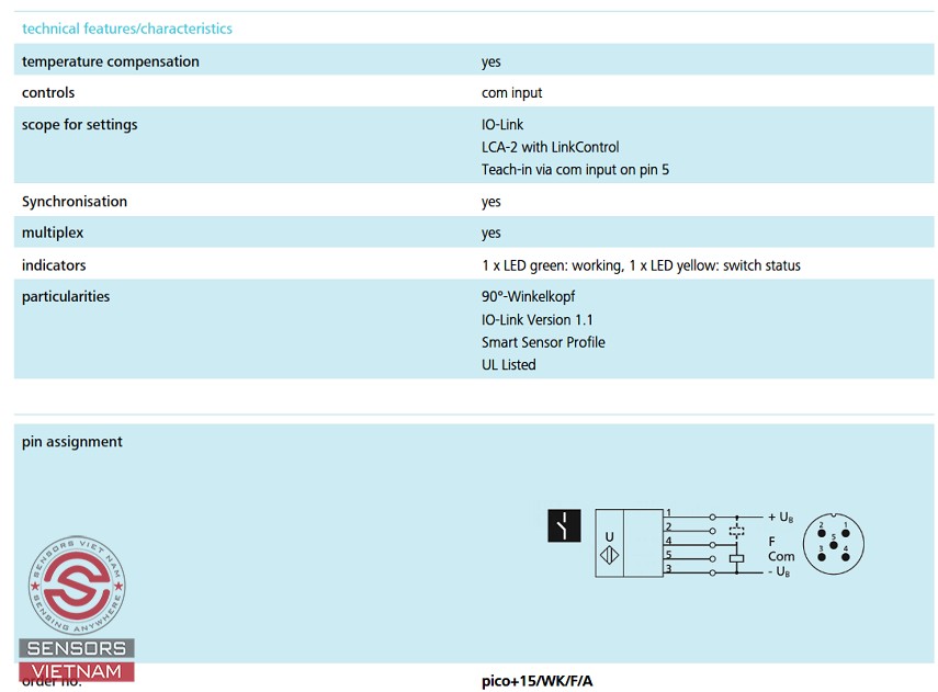 THÔNG SỐ KỸ THUẬT CỦA CẢM BIẾN SIÊU ÂM PICO+15/KW/F/A MICROSONIC NHƯ SAU: