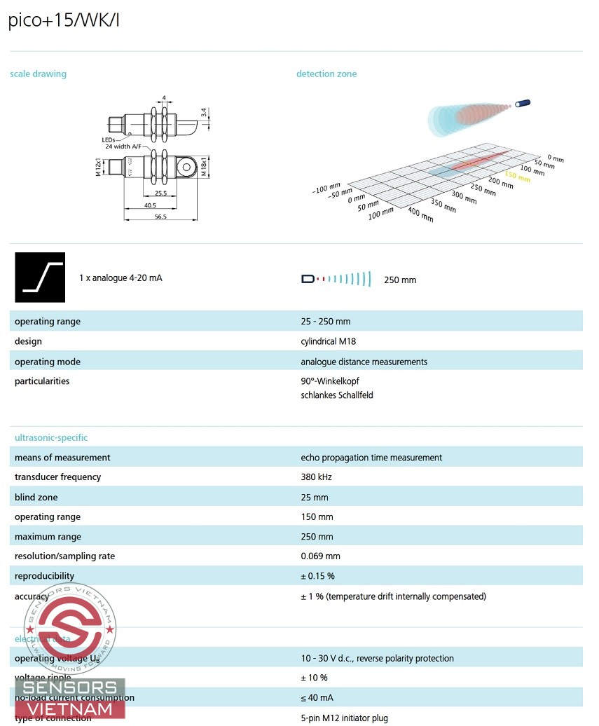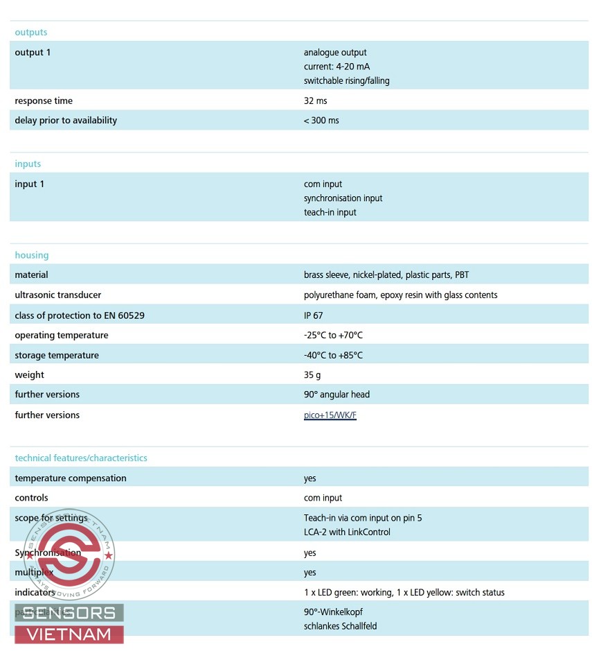 THÔNG SỐ KỸ THUẬT CỦA CẢM BIẾN SIÊU ÂM PICO+15/KW/I MICROSONIC NHƯ SAU: