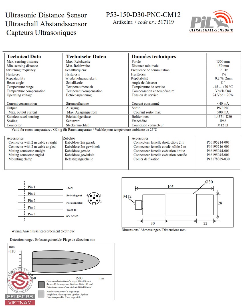CẢM BIẾN SIÊU ÂM PIL P53-150-D30-PNC-CM12, CẢM BIẾN SIÊU ÂM THÉP KHÔNG RỈ, CẢM BIẾN SIÊU ÂM ĐO KHOẢNG CÁCH, CẢM BIẾN SIÊU ÂM ĐO MỨC, CẢM BIẾN SIÊU ÂM PHÁT HIỆN VẬT CẢN, CẢM BIẾN SIÊU ÂM PNP/NC, CẢM BIẾN SIÊU ÂM NGÀNH CÔNG NGHIỆP THỰC PHẨM PIL.