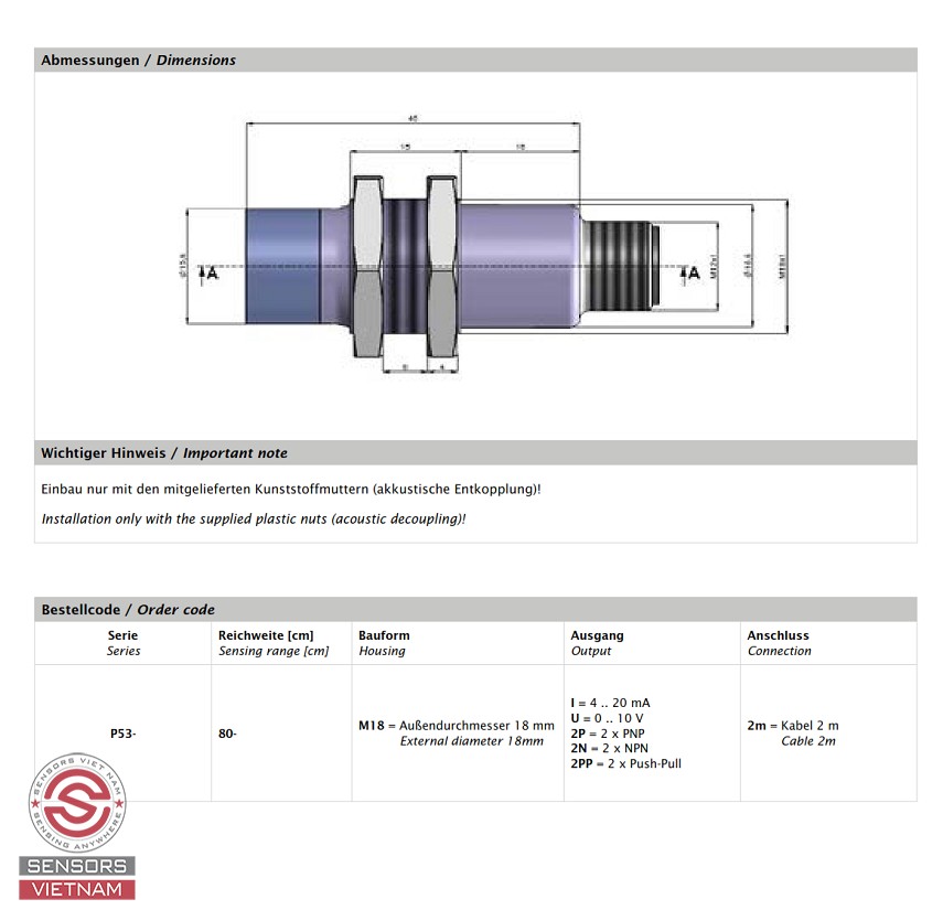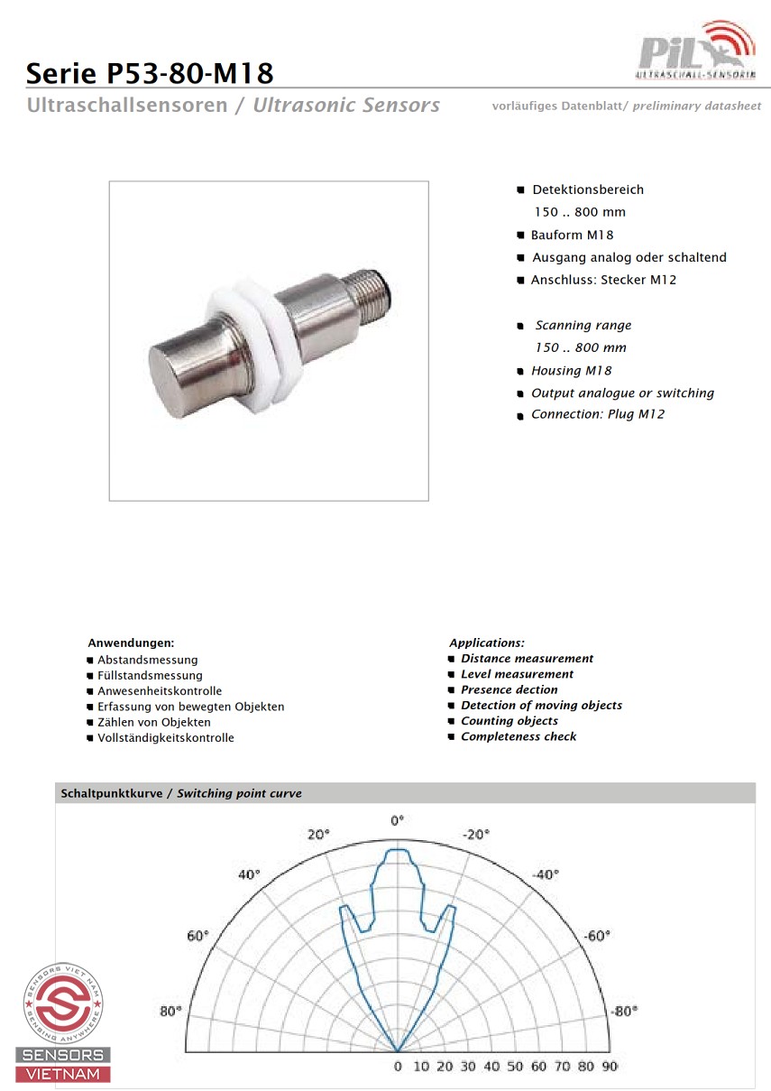 CẢM BIẾN SIÊU ÂM PIL P53-80-M18-I-CM12, CẢM BIẾN SIÊU ÂM THÉP KHÔNG RỈ, CẢM BIẾN SIÊU ÂM ĐO KHOẢNG CÁCH, CẢM BIẾN SIÊU ÂM ĐO MỨC, CẢM BIẾN SIÊU ÂM PHÁT HIỆN VẬT CẢN, CẢM BIẾN SIÊU ÂM ANALOG, CẢM BIẾN SIÊU ÂM NGÀNH CÔNG NGHIỆP THỰC PHẨM PIL.