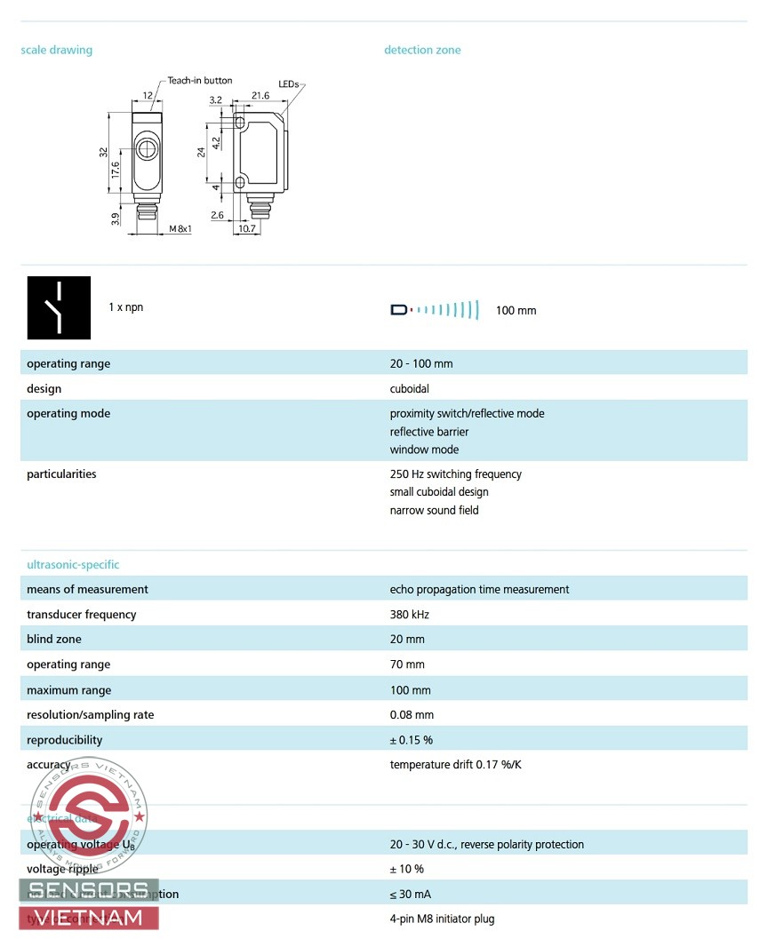 Cảm biến là gì? Cảm biến là một trong ba thành phần cơ bản của hệ thống điều khiển. Cảm biến là thiết bị điện tử cảm nhận những trạng thái hay quá trình vật lý hay hóa sang tín hiệu điện có thể đo lường được. Sensors Việt Nam chuyên phân phối cảm biến Siêu âm Microsonic (Germany) tại Việt Nam, Đại lý cảm biến siêu âm Microsonic, phân phối cảm biến Microsonic, Cảm biến Siêu âm ZWS-7 với dải đo trong khoảng 20-100mm.