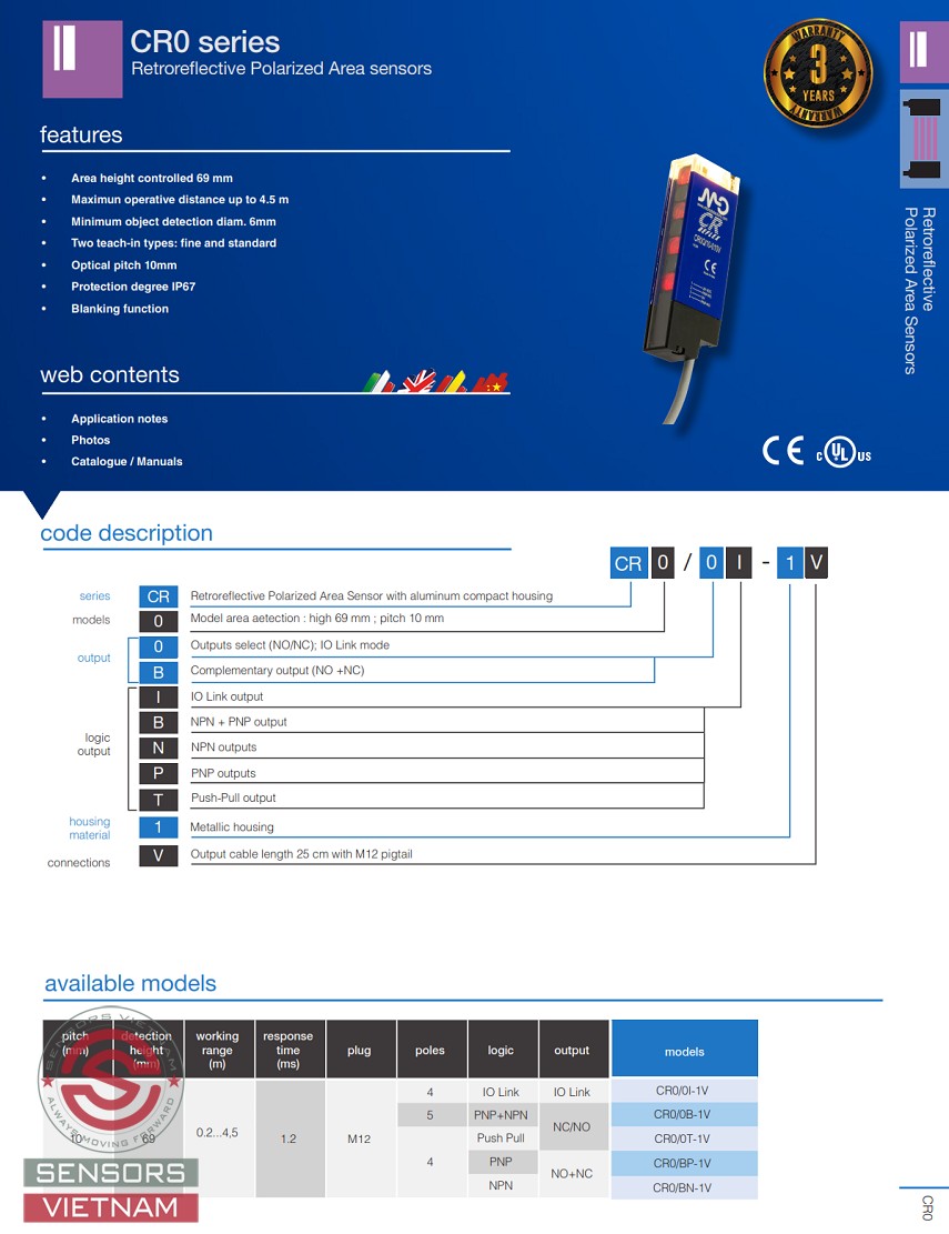 Cảm biến vùng CR0/0B-1V h = 69m, Sn 4,5m PNP+NPN NO/NC pig-tail M12 5pin