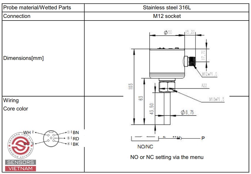 NPN NO/NC, cấu tạo gồm INOX 316L với độ dài đầu dò cảm biến là 200mm.