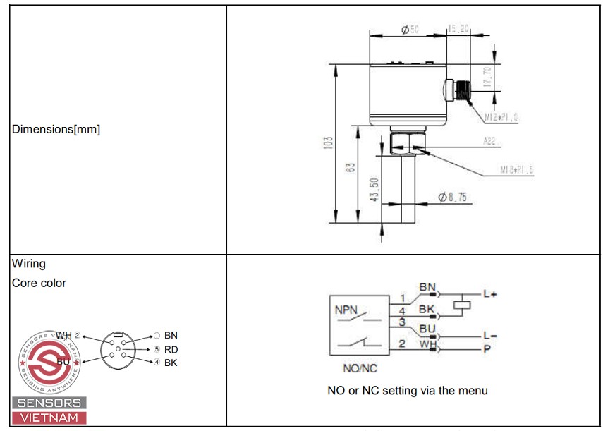 Công tắc lưu lượng nước FL6002 có dải đo 3 - 300 cm/s, Relay NPN NO/NC, cấu tạo bằng thép không rỉ INOX 316L với độ dài đầu dò cảm biến là 45mm.