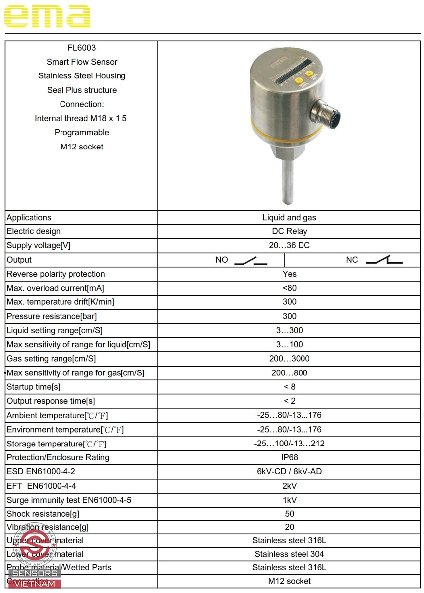 Công tắc lưu lượng nước FL6003 có dải đo 3 - 300 cm/s, Relay NO/NC, cấu tạo bằng thép không rỉ INOX 316L với độ dài đầu dò cảm biến là 45mm.