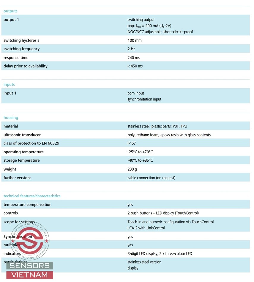 THÔNG SỐ KỸ THUẬT CỦA CẢM BIẾN SIÊU ÂM MIC+600/D/TC/E MICROSONIC NHƯ SAU: